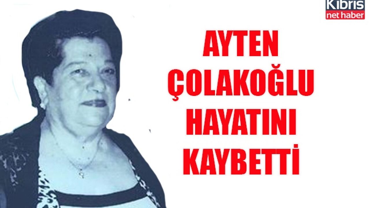 Lefkoşa'da sakin Ayten Çolakoğlu 9 Mayıs 2022 Pazartesi günü yaşamını yitirdi. Cenazesi 11 Mayıs 2022 Çarşamba günü ( bugün) saat 11.00'de İsmail Safa Camii'nde kılınacak namazın ardından Lefkoşa kabristanlığına defnedilecek. Yaslı ailesi ve sevenlerine başsağlığı dileriz.