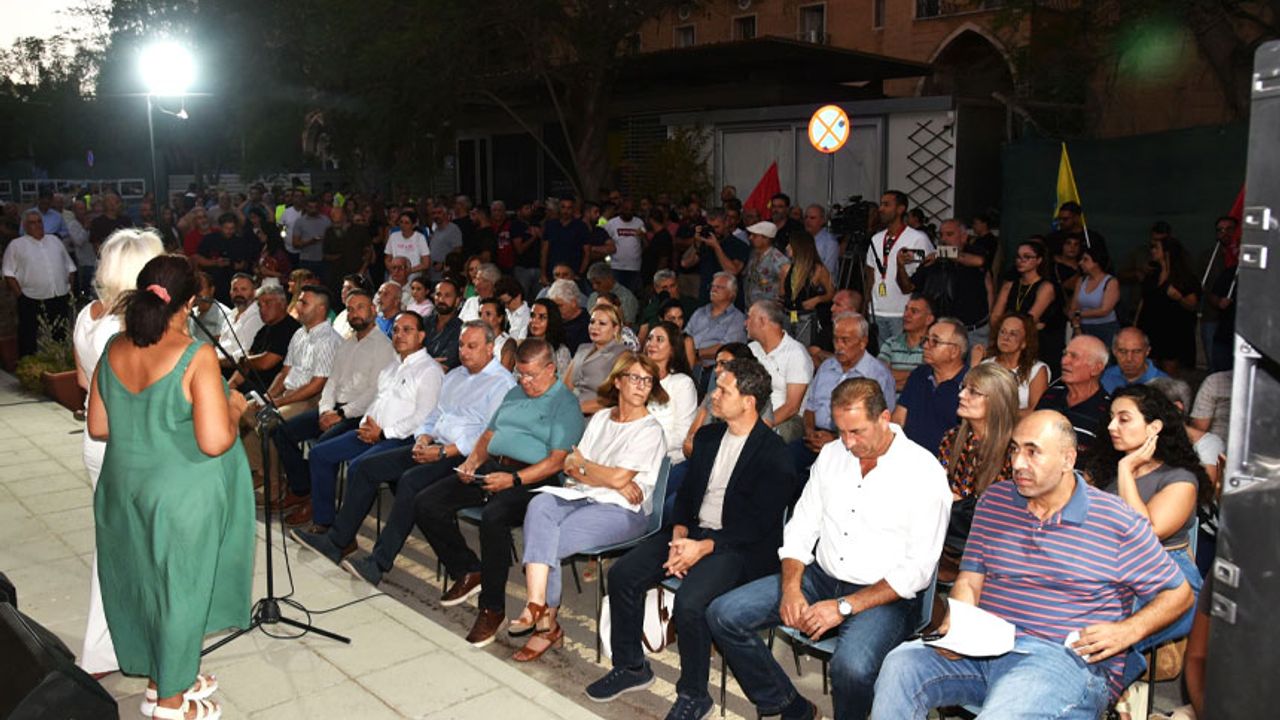 Etkinlikte, Devrimci İşçi Sendikaları Federasyonu (DEV-İŞ) Başkanı Semih Kolozali ve Güney Kıbrıs Solcu İşçi Sendikaları Federasyonu (PEO) Genel Sekreteri Sotirulla Haralambus ortak açıklamayı okudu.