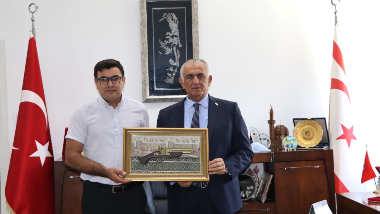 Dinyev, ziyaret sonunda Çavuşoğlu’na Karabağ Savaşı’nda Şuşa’nın alınmasını sembolize eden bir hediye takdim etti.