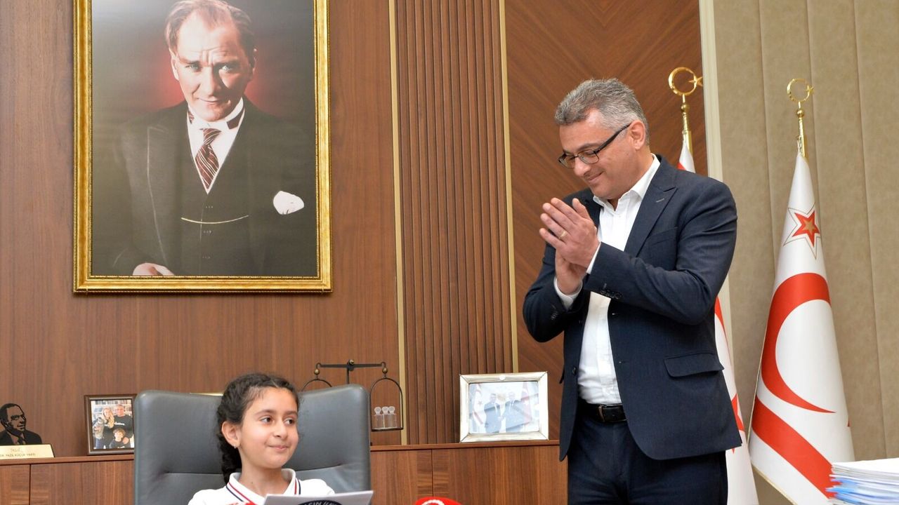 Öğrenciler ve öğretmenlerle sohbet eden Cumhurbaşkanı Erhürman, koltuğunu Şht Yalçın İlkokulu 5’nci sınıf öğrencisi Masal Şevki’ye bıraktı.