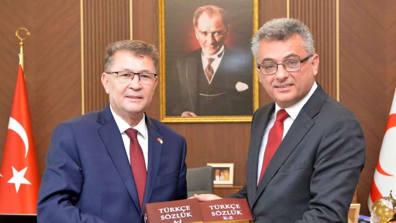 Türk Dil Kurumu Başkanı Prof. Dr. Osman Mert de yaptıkları çalışmalar hakkında bilgi vererek, Cumhurbaşkanı Erhürman’a Türkçe Sözlüğü’nün son baskını takdim etti.