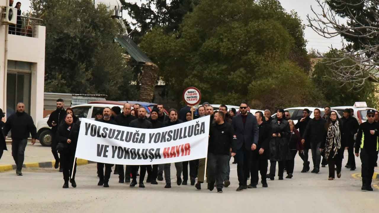 Taşkınköy Şefler Pastanesi önünde toplanan Kıbrıs Türk Amme Memurları Sendikası (KTAMS), Kıbrıs Türk Kamu Görevlileri Sendikası (KAMUSEN), Kamu İşçileri Sendikası (KAMU-İŞ), Kıbrıs Türk Öğretmenler Sendikası (KTÖS) ve Kıbrıs Türk Orta Eğitim Öğretmenler Sendikası (KTOEÖS) yetkilileri, Bayındırlık ve Ulaştırma Bakanlığı önüne yürüdü.