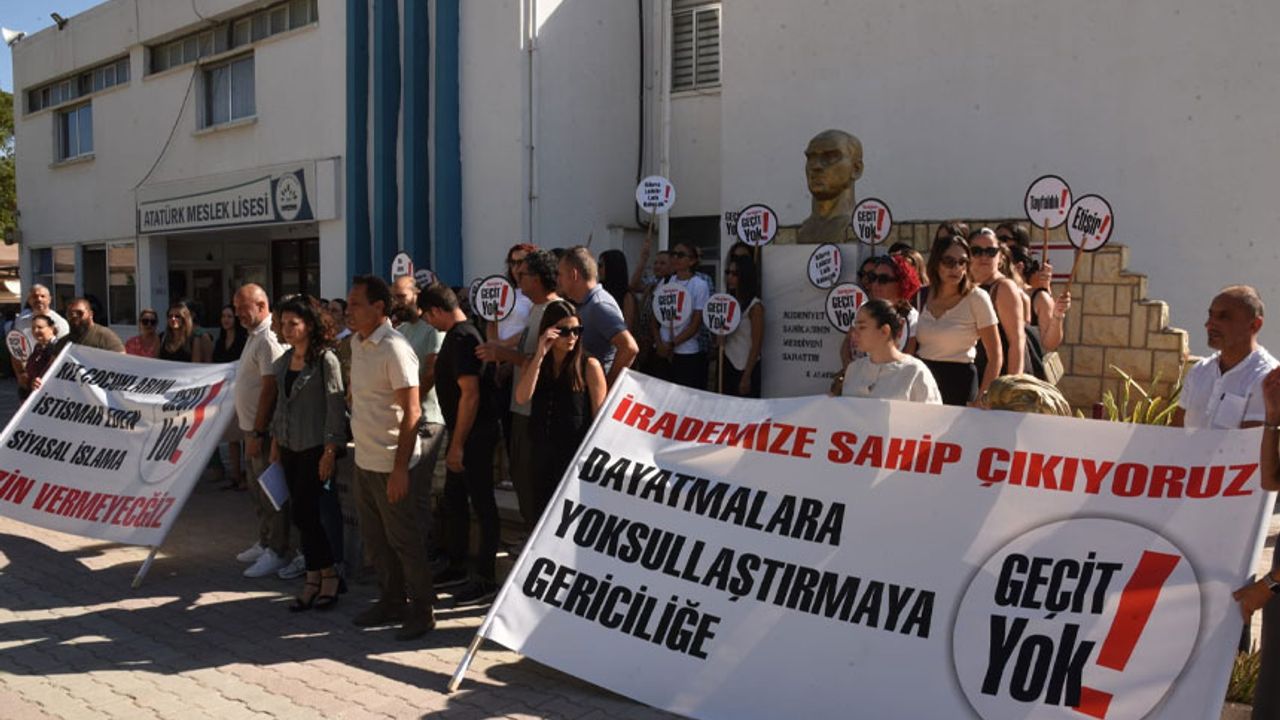 Eylemde, “İrademize sahip çıkıyoruz. Dayatmalara, yoksullaştırmaya, gericiliğe geçit yok”, “Kız çocuklarını istismar eden siyasal İslam’a izin vermeyeceğiz” yazılı pankartları açıldı; “Kıbrıs laiktir, laik kalacak”, “Geçit yok”, “Etişir”, “Tayfaldık” yazılı dövizler taşındı.