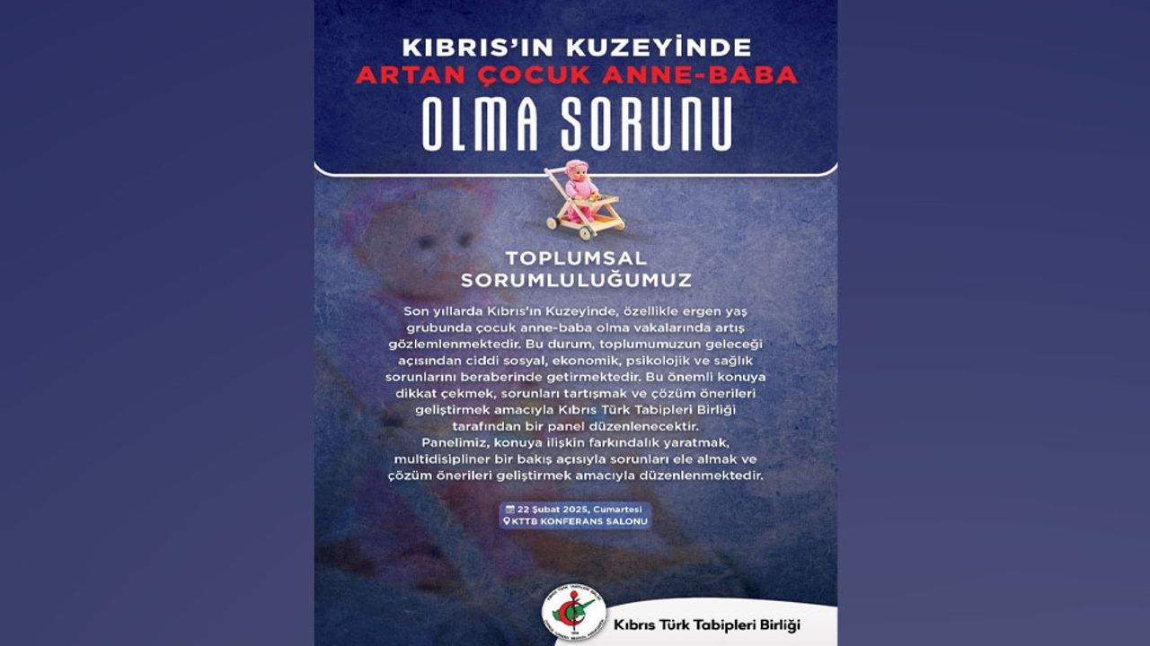 Kıbrıs Türk Tabipleri Birliği (KTTB) tarafından 22 Şubat Cumartesi günü “Kıbrıs’ın Kuzeyinde Artan Çocuk Anne-Baba Olma Sorunu: Toplumsal Sorumluluğumuz” başlıklı panel düzenlenecek.