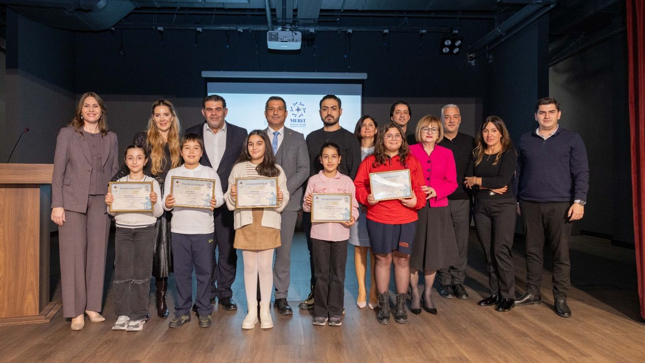Mansiyon ödülü almaya hak kazanan Alsancak İlkokulu öğrencilerinden Atalay Çeliköz’e Okul Müdürü Sait Coşaner; İklim Gül Nersin’e de Merit Otelleri İnsan Kaynakları Grup Müdürü Ozan Kırtay ödüllerini verdi.
