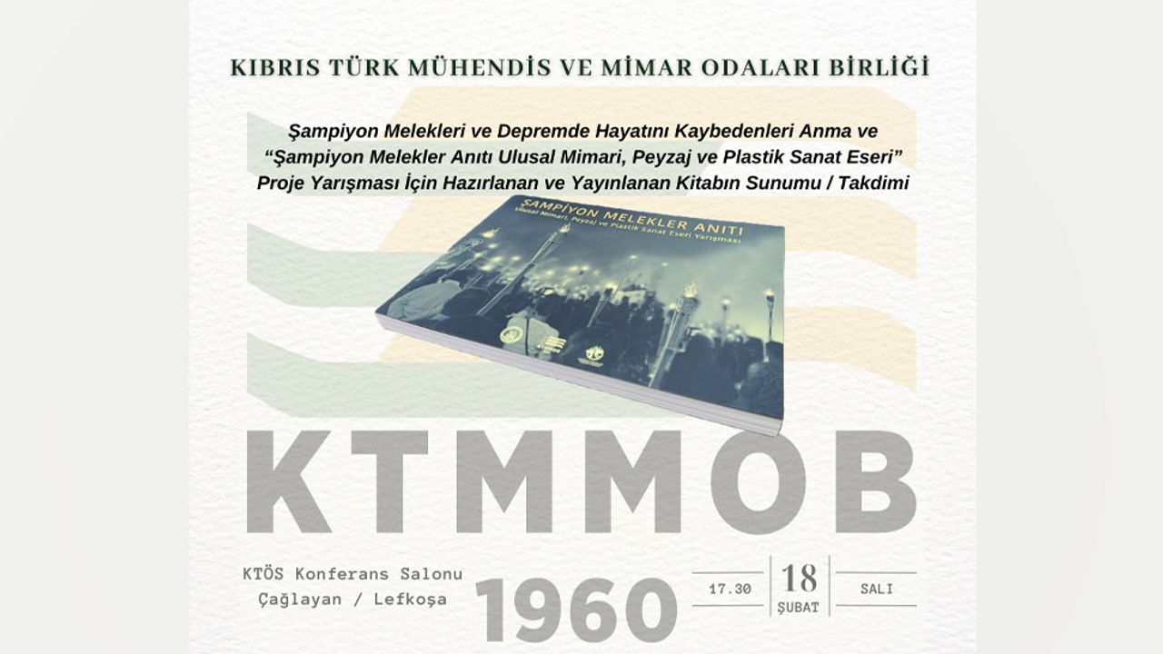 Kıbrıs Türk Mühendis ve Mimar Odaları Birliği (KTMMOB), 18 Şubat Salı günü Şampiyon Melekleri Anma ve Anıt Projesi Yarışması için hazırlanan kitabın tanıtım etkinliği düzenleneceğini duyurdu.