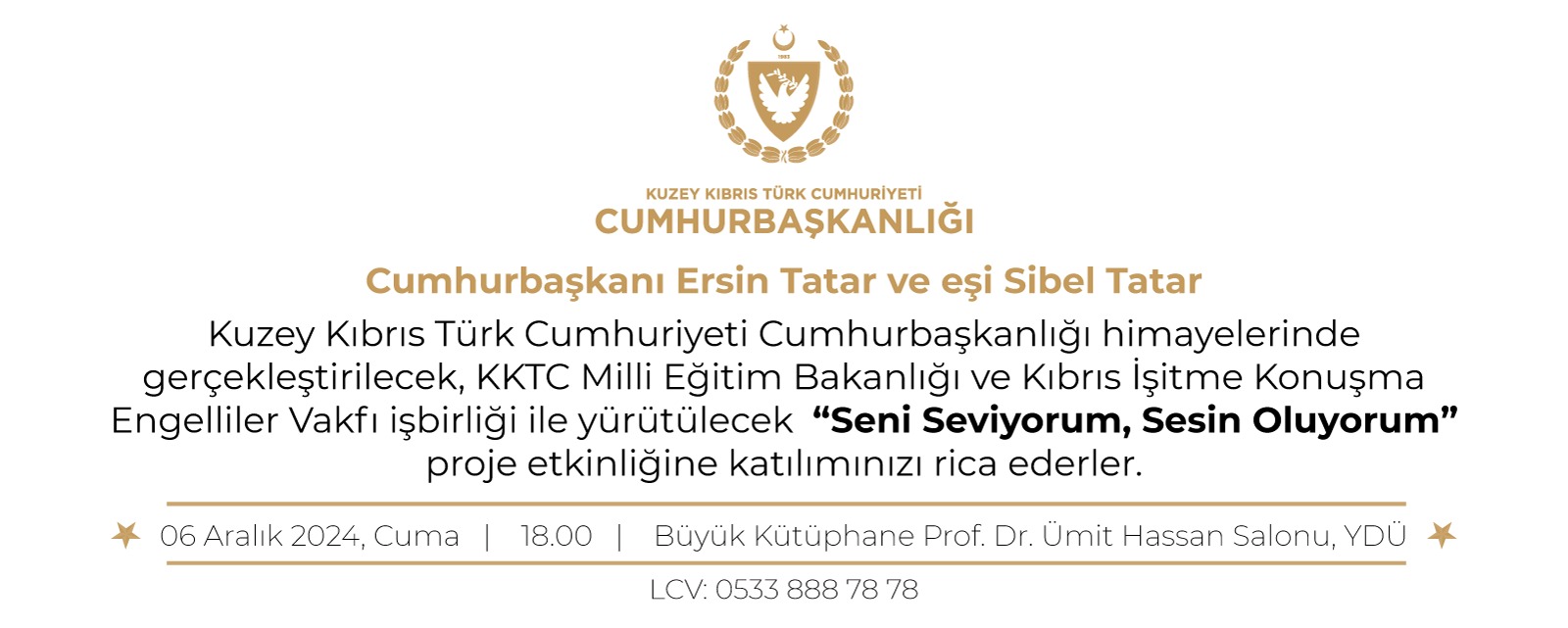 Cumhurbaşkanlığı'ndan verilen bilgiye göre, Milli Eğitim Bakanlığı, Kıbrıs İşitme ve Konuşma Engelliler Vakfı (KİKEV) iş birliğinde Telsim’in desteği ve BRT’nin ana medya sponsorluğunda “Seni seviyorum sesin oluyorum” sloganıyla hayat bulacak “Sürdürülebilir Eğitimde Sosyal ve Toplumsal Farkındalığa Destek Projesi” kapsamında işaret diliyle ilgili hazırlanacak eğitim videolarının tanıtımı yapılacak.
